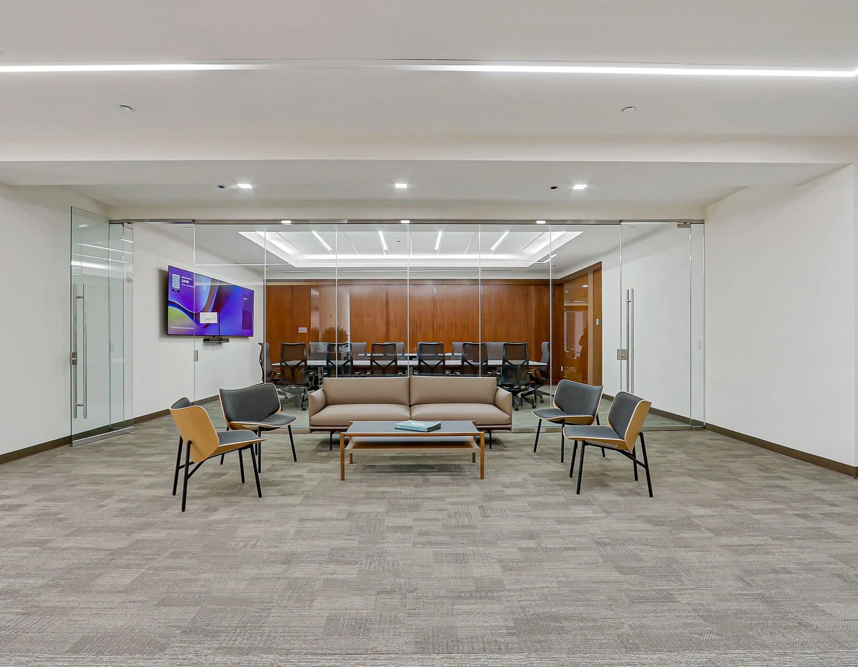 The Helen of Troy office renovation exemplifies a modern approach to workplace design, emphasizing transparency, light, and spatial efficiency. The space takes advantage of expansive exterior glazing to introduce abundant natural light, enhancing both visual comfort and energy efficiency. Floor-to-ceiling glass partitions define individual offices and meeting areas, creating an open visual connection throughout the corridor while maintaining acoustic privacy. This design reflects not only the client’s operational needs but also their commitment to creating an elegant, forward-thinking workplace.